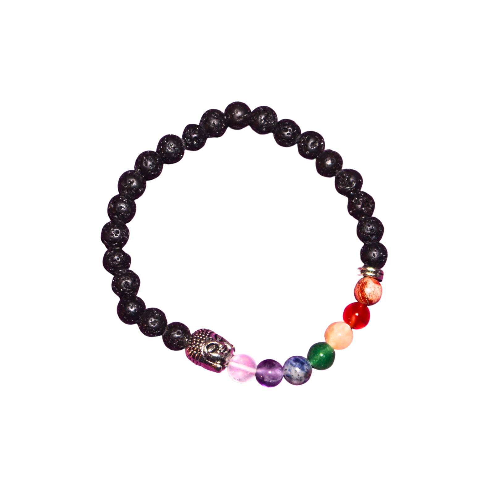 Connect with your inner self and protect your energy with this Seven Chakra bracelet with Buddha pendant and 6mm volcanic stone beads.