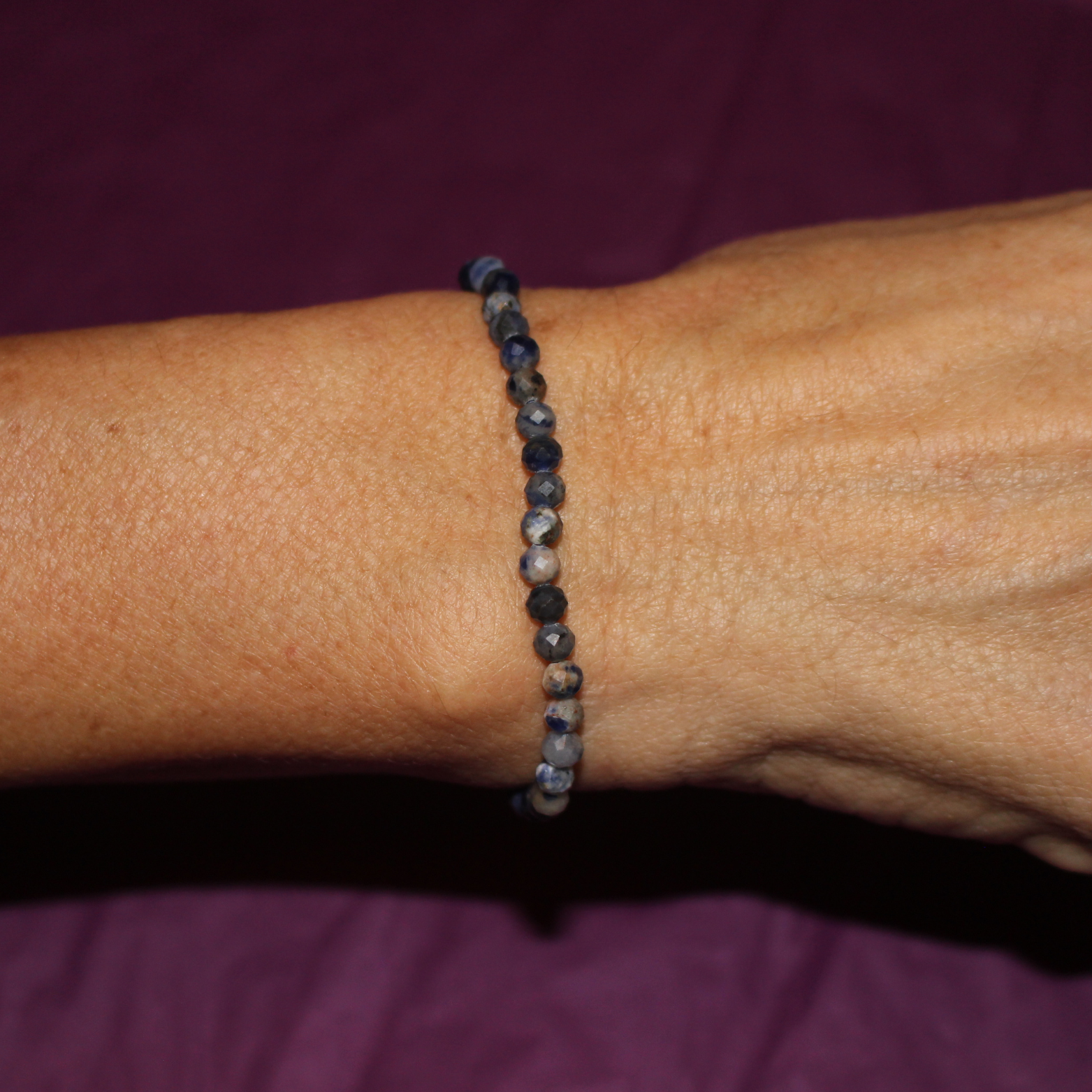 La Pulsera Facetada de Sodalita es un amuleto natural cuidadosamente hecho a mano, diseñada para fomentar la claridad mental, la comunicación y la protección energética.