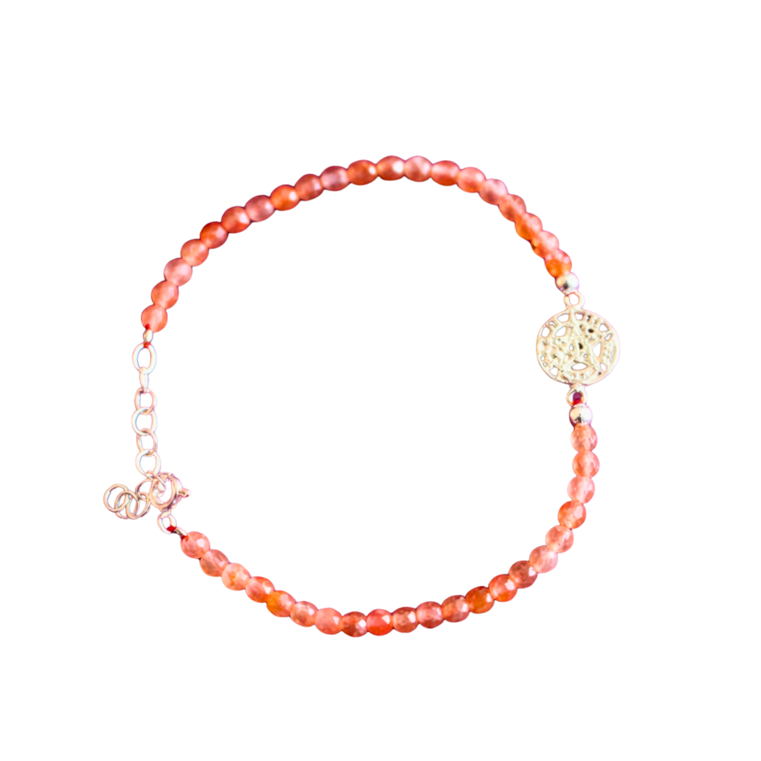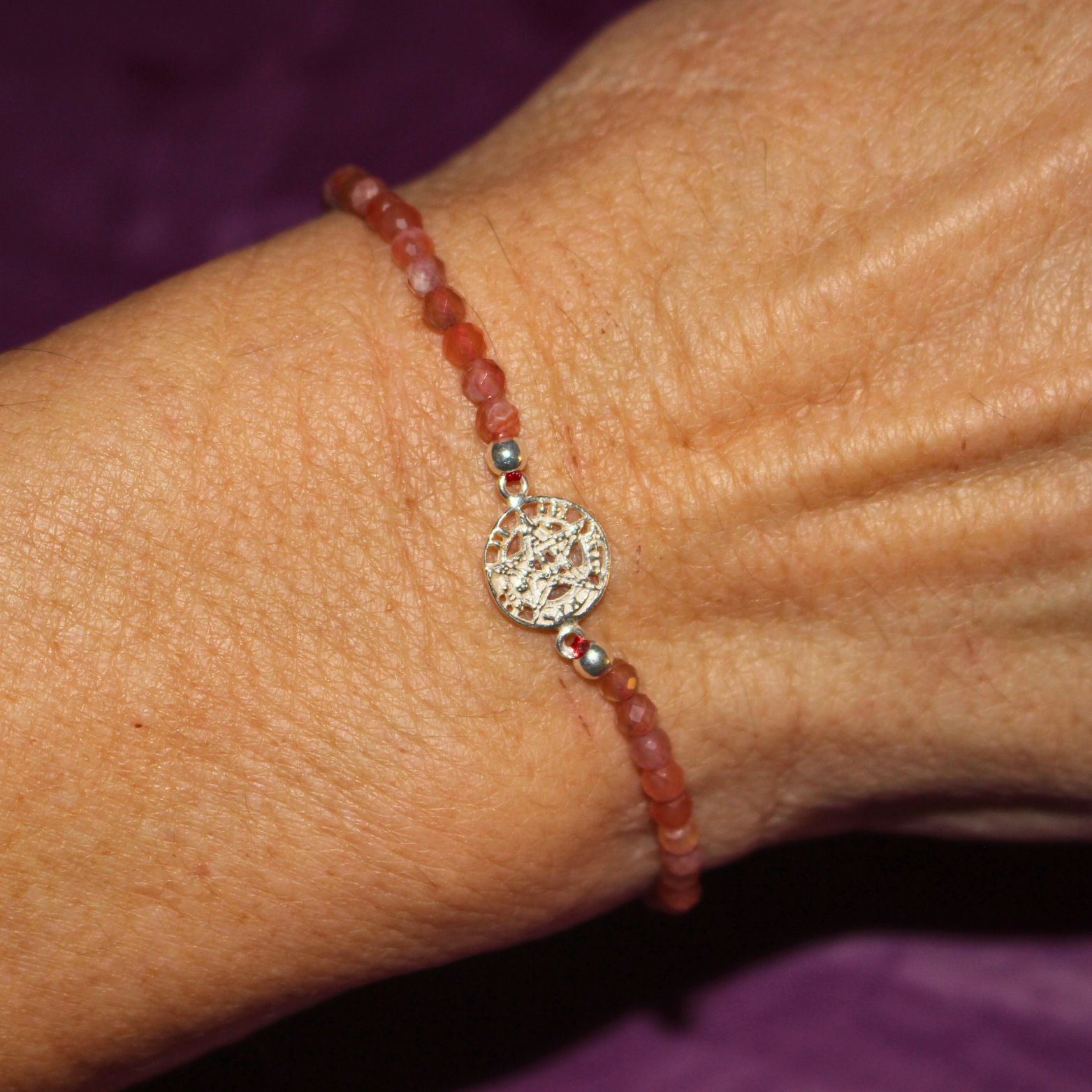 Elaborada con cuentas facetadas de Piedra Solar natural de 4 mm, esta pulsera combina la energía luminosa del sol con el poder protector del Tetragramatón en Plata de Ley 925, creando una pieza de equilibrio, fuerza interior y resguardo espiritual.